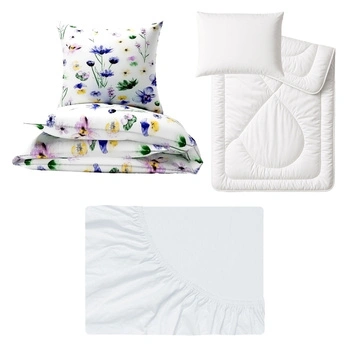 Zestaw pościeli 100x160 + 50x60 + prześcieradło jersey 80x160 | 348Mbi | biała | kwiaty i motyle
