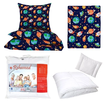 Zestaw pościeli 100x160 + 50x60 + prześcieradło we wzorze 80x160 | 202cie | granatowo pomarańczowa | planety kosmos
