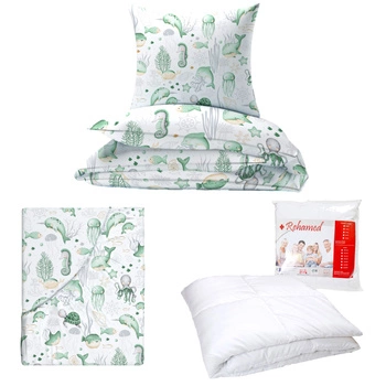 Zestaw pościeli 100x160 + 50x60 + prześcieradło we wzorze 80x160 | 235zie | biało zielona | morski