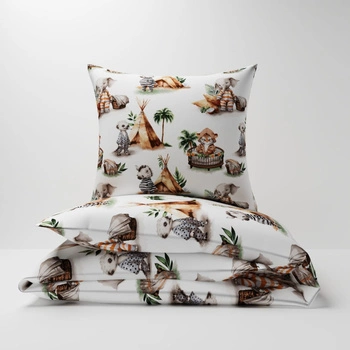 Pościel dla dziecka bawełniana 100x140 + poszewka na poduszkę 40x60 | 104tip | biała | zwierzątka na campingu