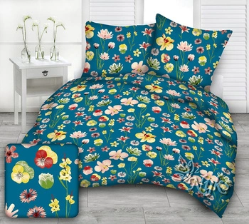 Pościel bawełniana 140x200 + poszewka na poduszkę 50x60 | 158eme | emeraldowa | kwiaty bratki