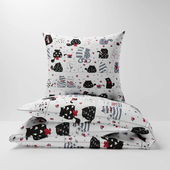 Pościel dla dziecka bawełniana 120x180 + poszewka na poduszkę 50x60 | 061b-c | biało czerwona | koty