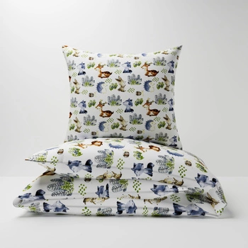 Pościel dla dziecka bawełniana 120x180 + poszewka na poduszkę 70x80 | 014now | biało niebieska | zwierzątka leśne