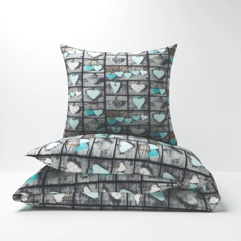 Pościel flanela 160x200 + poszewki na poduszkę 2*70x80 | 073trk | szaro turkusowa | serca walentynki