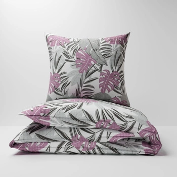Pościel z kory 200x220 + poszewki na poduszkę 2*70x80 | 455róż | szaro różowa | liście monstera