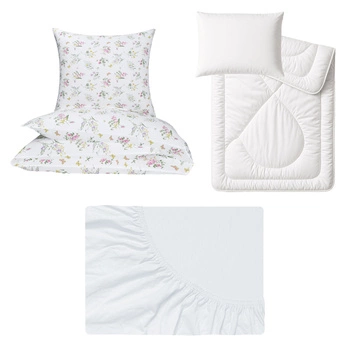 Zestaw pościeli 100x160 + 40x60 + prześcieradło jersey 80x160 | 121kon | biała | polne kwiaty