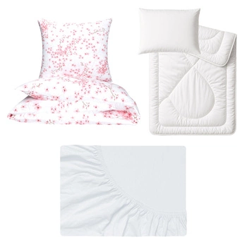 Zestaw pościeli 100x160 + 50x60 + prześcieradło jersey 80x160 | 007roz | biala | kwiat wiśni
