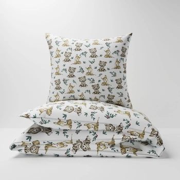 Pościel dla dziecka bawełniana 100x160 + poszewka na poduszkę 50x60 | 050bra | biała | sarenki i misie