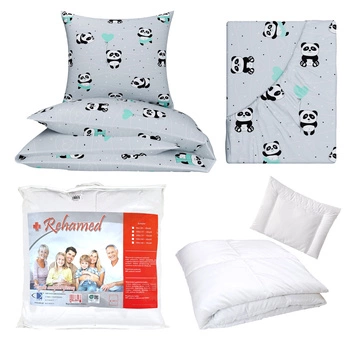 Zestaw pościeli 100x160 + 40x60 + prześcieradło we wzorze 80x160 | 198Pmi | szaro miętowa | misie panda