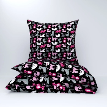 Pościel bawełniana 160x200 + poszewka na poduszkę 50x60 | 432ama | czarno różowa | koty