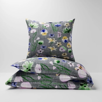 Pościel z kory 200x220 + poszewki na poduszkę 2*70x80 | 348sza | szaro turkusowa | kwiaty bratki