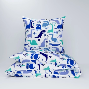 Pościel bawełniana 160x200 + poszewka na poduszkę 50x60 | 411din | biało niebieska | dinozaury