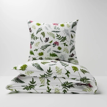 Pościel bawełniana 200x220 + poszewki na poduszkę 2*70x80 | 124pap | biało zielona | liście paproć