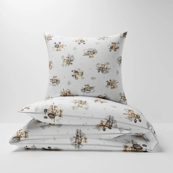 Pościel dla dziecka bawełniana 90x120 + poszewka na poduszkę 40x60 | 303Sbe | biało beżowa | misie samoloty