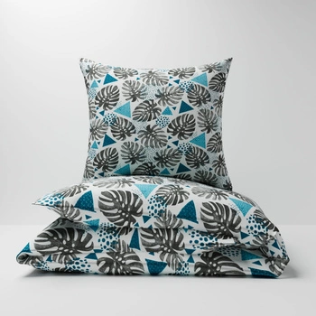 Pościel bawełniana 160x200 + poszewka na poduszkę 70x80 | 052trk | biało turkusowa | liście monstery