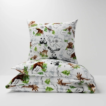 Pościel dla dziecka bawełniana 90x120 + poszewka na poduszkę 40x60 | 198map | biała | kontynenty zwierzęta