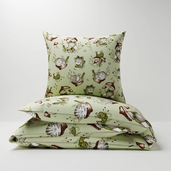 Pościel bawełniana 140x200 + poszewka na poduszkę 50x60 | 210zab | zielona | koty żabki słonie