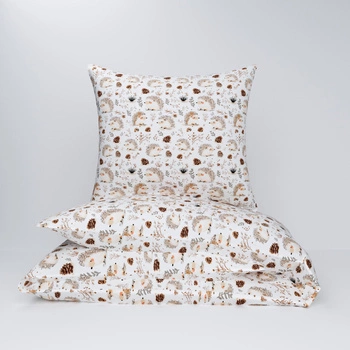 Pościel bawełniana 200x220 + poszewki na poduszkę 2*70x80 | 020Nje | biało brązowa | jeże zwierzątka