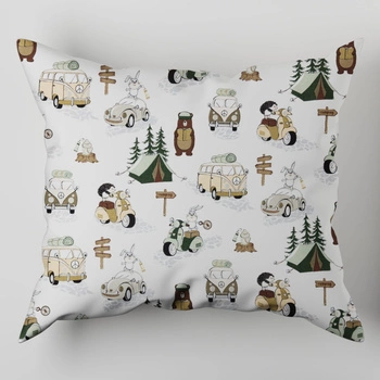 Poszewka bawełniana na poduszkę 50x50 | 099beż | biało brązowa | miś na campingu
