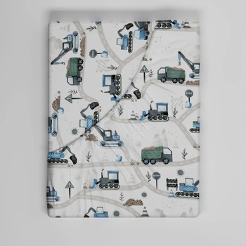 Prześcieradło z gumką do łóżeczka 80x200 bawełniane | 056nie | niebieskie | koparki