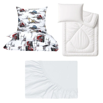 Zestaw pościeli 100x160 + 50x60 + prześcieradło jersey 80x160 | 404tra | biała | koparki traktory