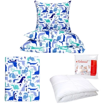 Zestaw pościeli 100x160 + 50x60 + prześcieradło we wzorze 80x160 | 411din | biało niebieska | dinozaury