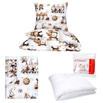 Zestaw pościeli 100x160 + 50x60 + prześcieradło we wzorze 80x160 | 400bra | biało brązowa | świąteczna gnomy skrzaty