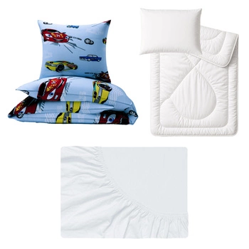 Zestaw pościeli 100x160 + 40x60 + prześcieradło jersey 80x160 | 136nie | niebieska | samochody
