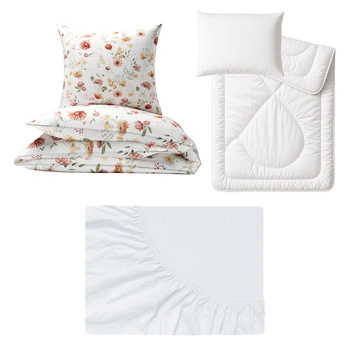Zestaw pościeli 100x160 + 50x60 + prześcieradło jersey 80x160 | 426los | biała | kwiaty jabłoni